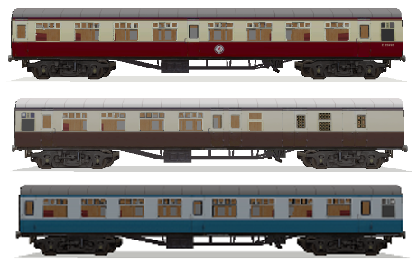 Consisting of all types from Mk1 to Mk3, including generator cars, restaurant cars, driving trailers etc. Required for: Ballyfeckin; Kilmagranny Heritage